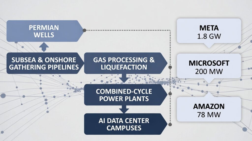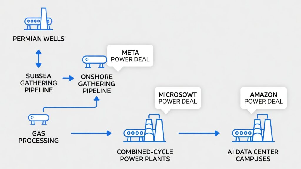 ( image: Flow diagram showing Permian wells → subsea/onshore gathering pipelines → gas processing → combined-cycle power plants → AI data center campuses, with callouts for Meta/Microsoft/Amazon power deals.)