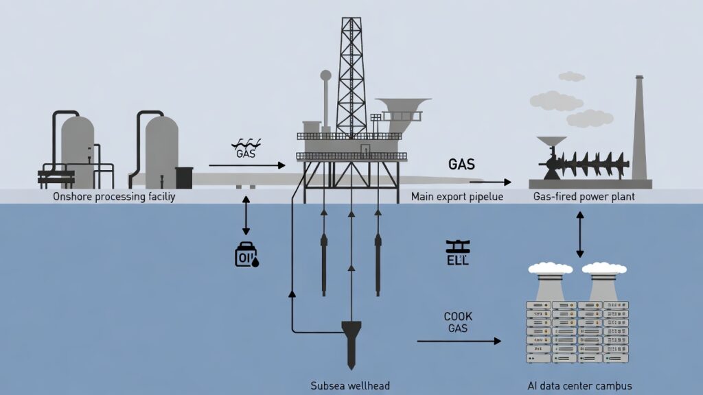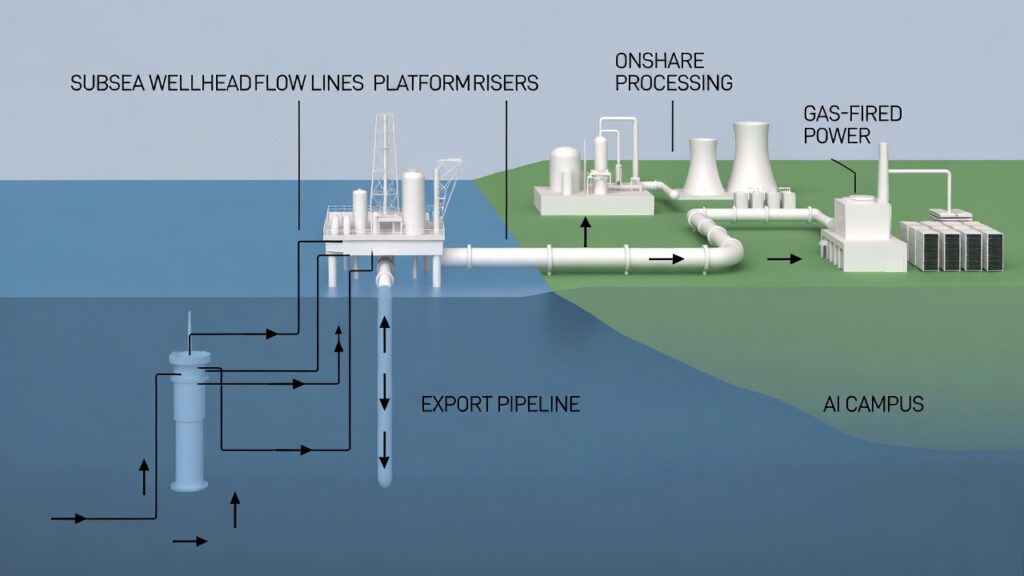 ( image: Schematic from subsea wellhead → flow lines → risers → platform → export pipeline → onshore processing → gas-fired power → AI campus.)