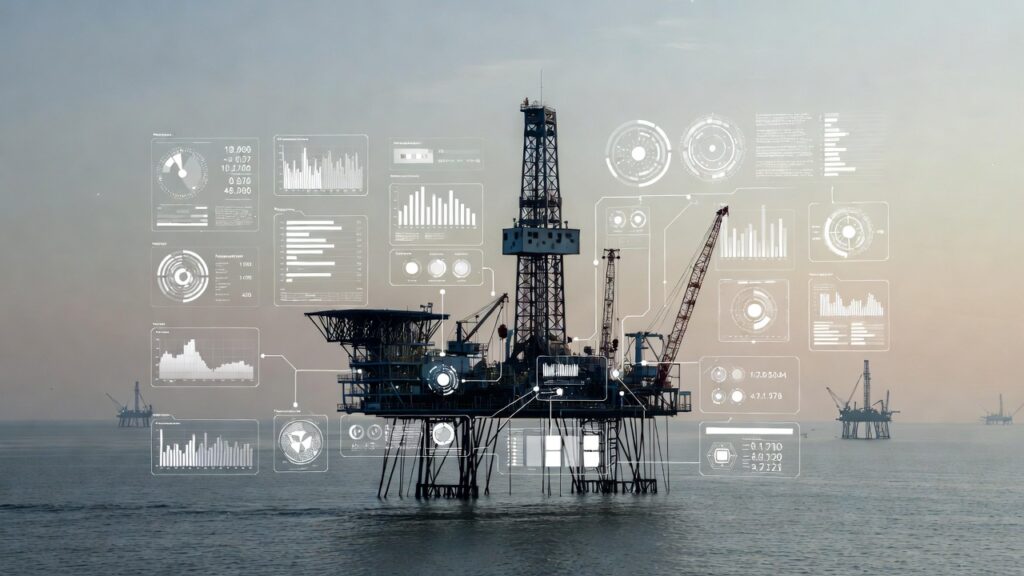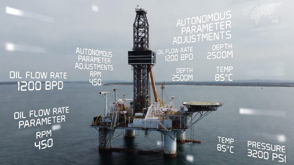 Visual: Offshore drilling rig with digital overlay showing autonomous parameter adjustments across the ecosystem.