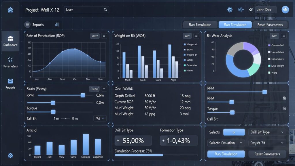 Visual: Digital twin dashboard showing analytical simulation of drilling scenarios and parameter optimization.