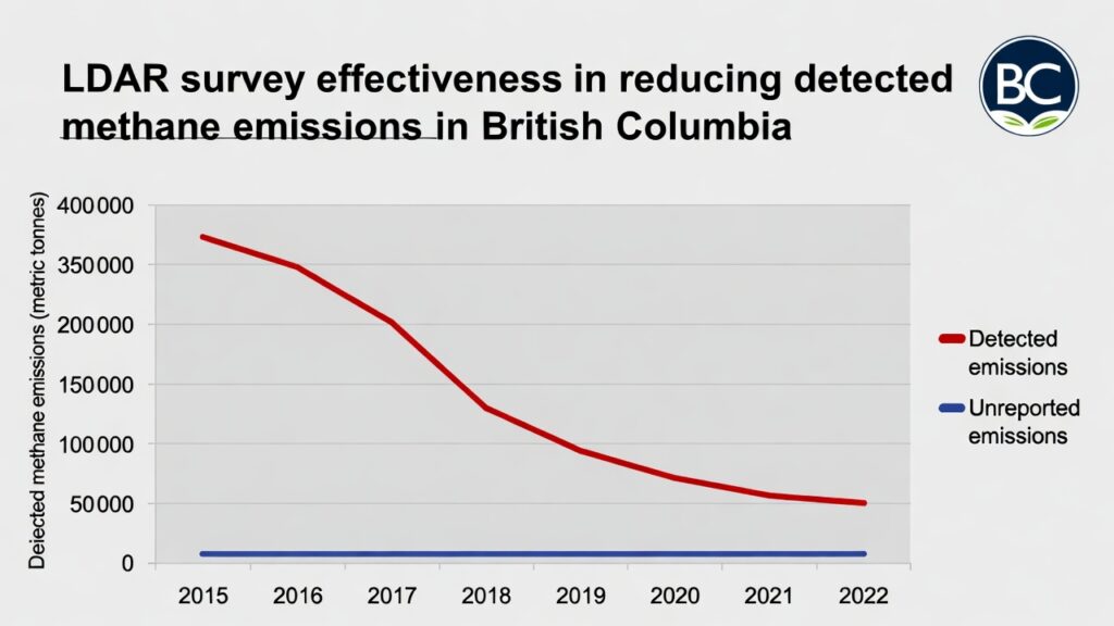 Visual: Diagram illustrating LDAR survey effectiveness in reducing detected methane emissions over multiple years in British Columbia.
