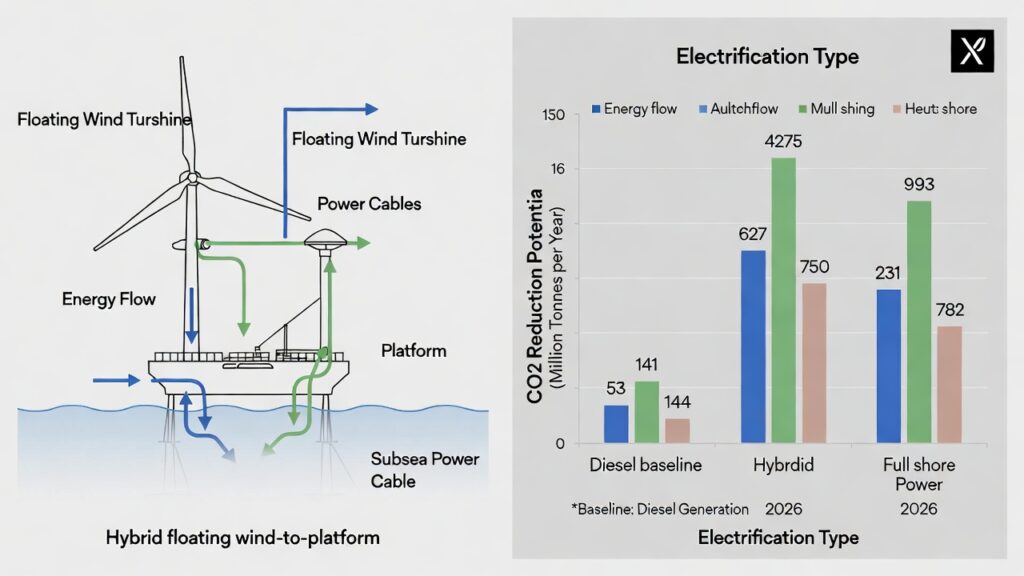 - Electrification type: Hybrid floating wind (11 × 8 MW turbines) powering 5 platforms