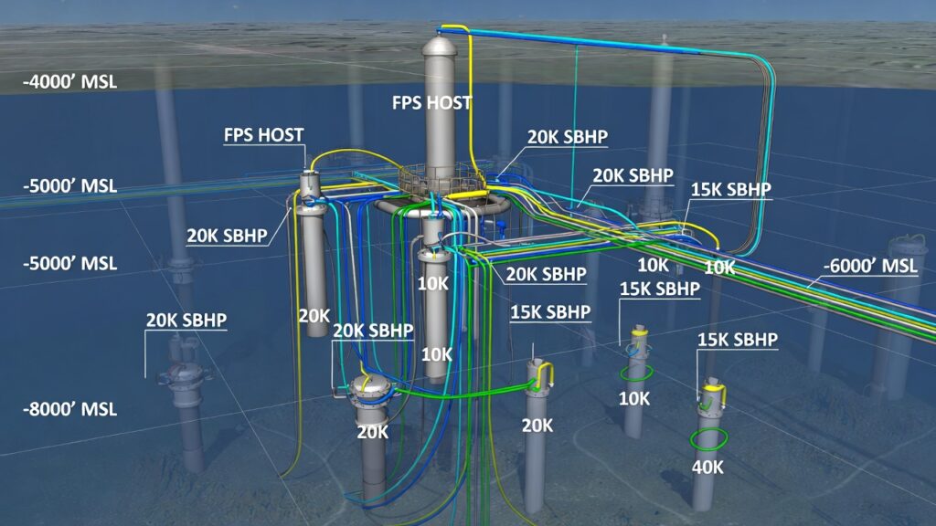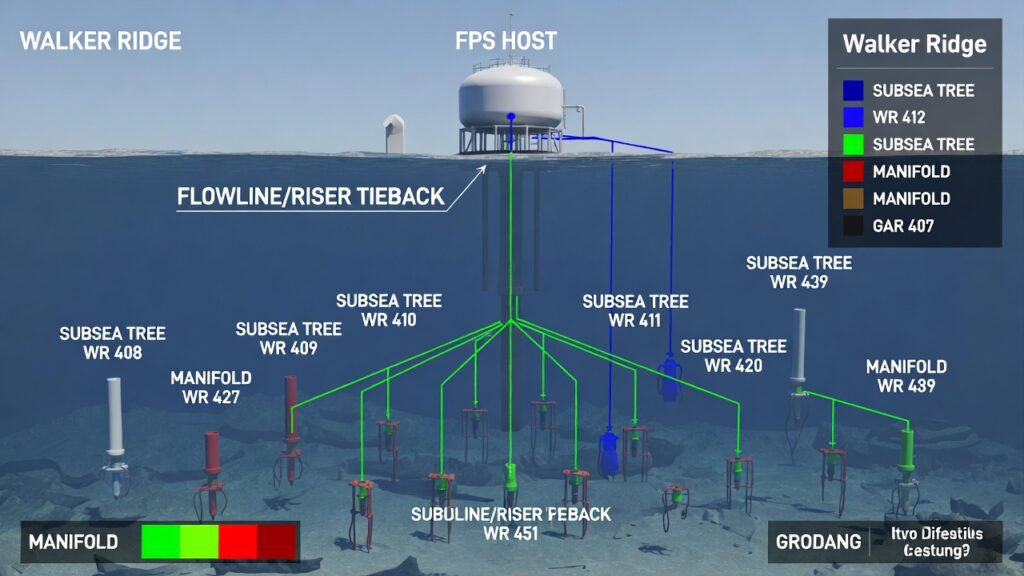 ( image: 3D schematic showing FPS host, flowline/riser tieback, subsea trees/manifolds in Walker Ridge blocks, with depth labels and HPHT equipment callouts. Color-coded for 20K-rated components.)