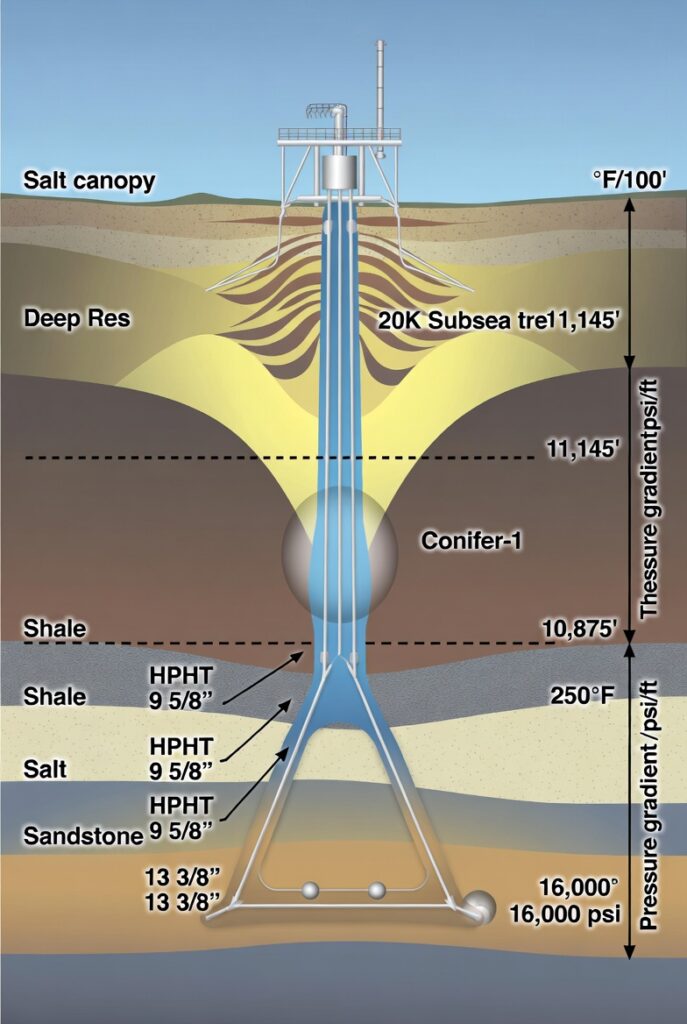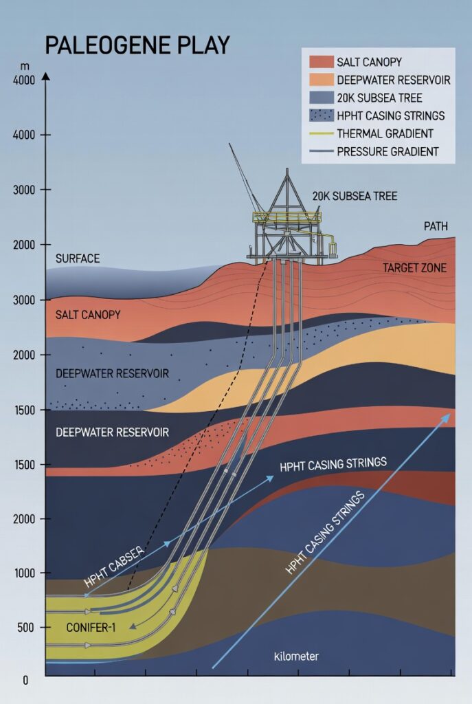 (Insert image: Geological cross-section of Paleogene play showing salt canopy, deep reservoir, 20K subsea tree, HPHT casing strings, and thermal/pressure gradient labels. Highlight Conifer-1 target zone.)