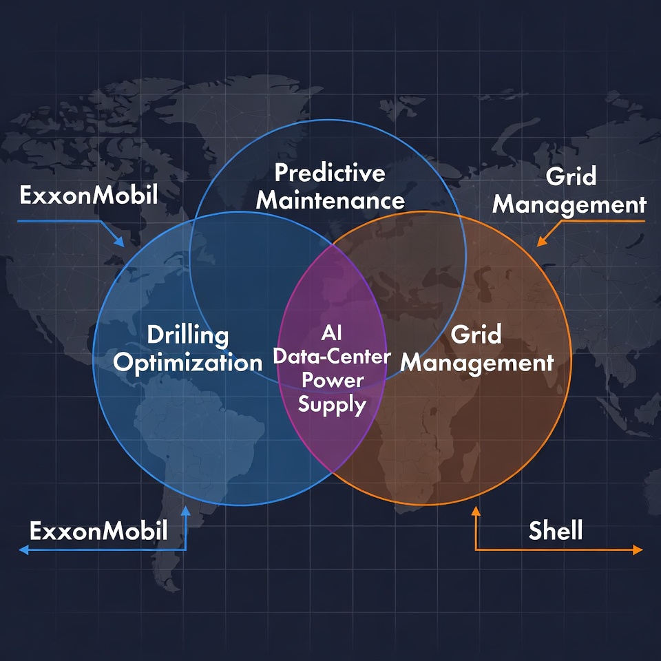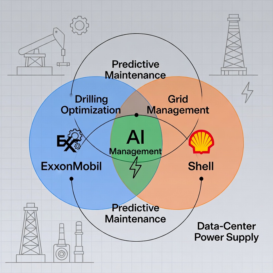 ( image: Venn diagram or split chart showing shared AI uses: drilling optimization, predictive maintenance, grid management, and data-center power supply.)