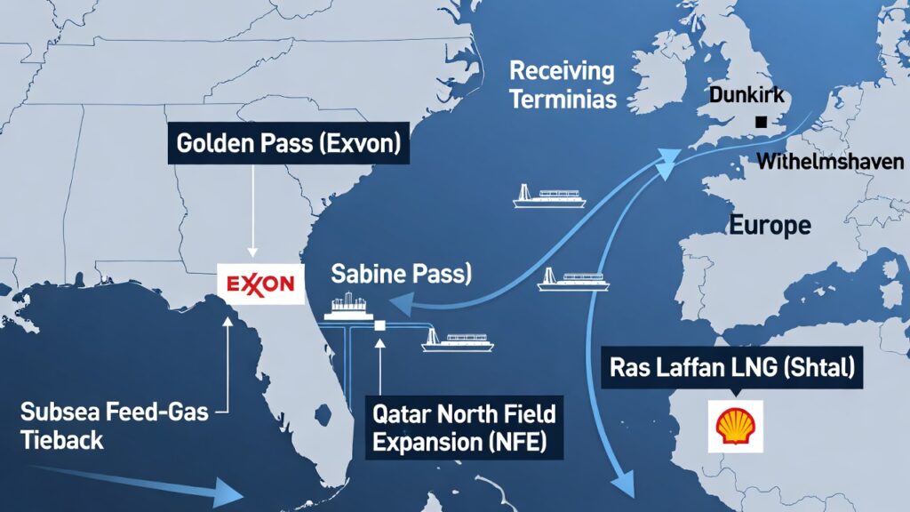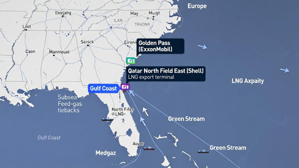 ( image: Map showing Exxon/Shell LNG export terminals (Golden Pass, Qatar NFE) and shipping routes to Europe, with callouts for subsea feed-gas tiebacks.)