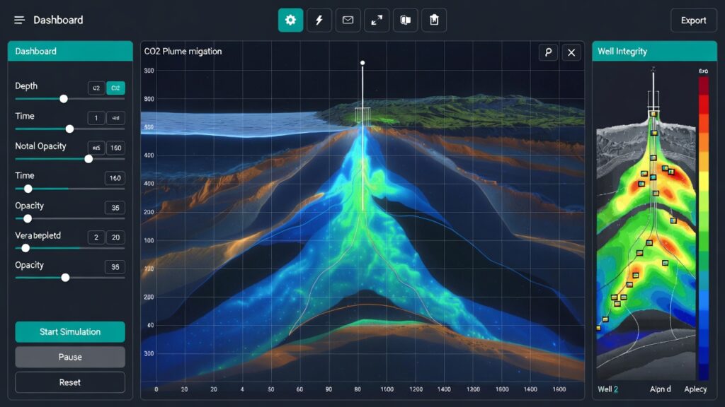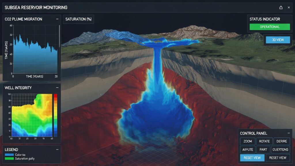- Figure 1: 3D digital twin dashboard showing CO₂ plume migration in a depleted subsea reservoir (color-coded saturation + well integrity heat map).