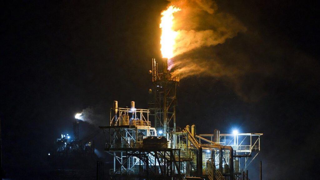 Visual: Typical offshore platform with visible flare stack during routine flaring operations.Another real-world example of offshore flaring at night, highlighting the scale of combustion emissions.