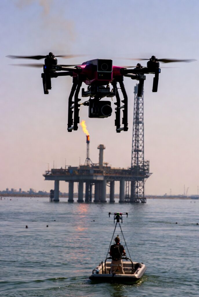 These tools enable quantification under OGMP levels 4–5 (site-level and source-level measurement).Drone-based methane detection in action on an offshore facility.Another view of drone deployment for emissions surveying near offshore infrastructure.