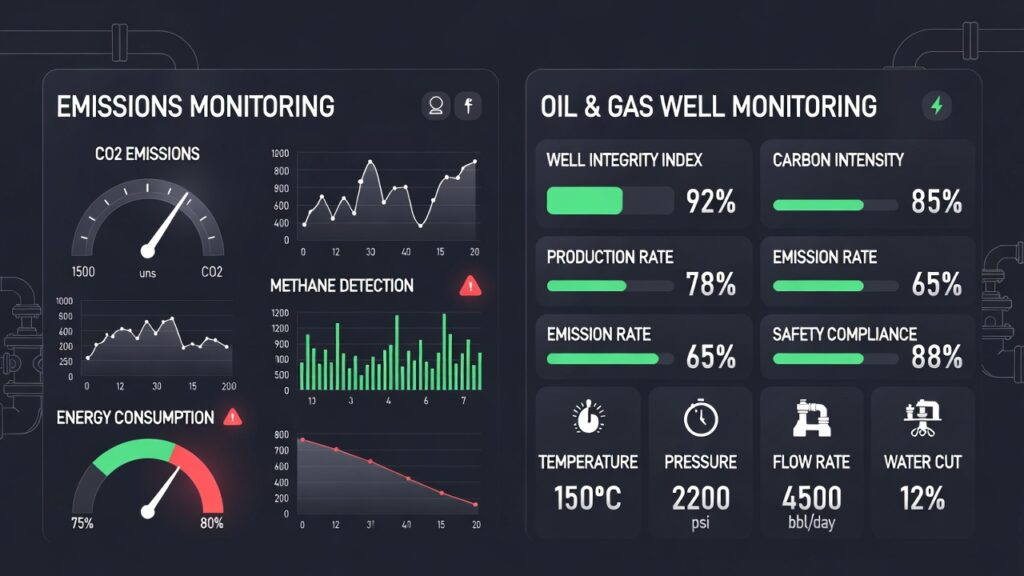 Example of an industrial emissions monitoring dashboard showing real-time CO₂, methane, and energy metrics.Another comprehensive KPI dashboard for oil & gas well monitoring, including carbon emissions and well integrity indices.