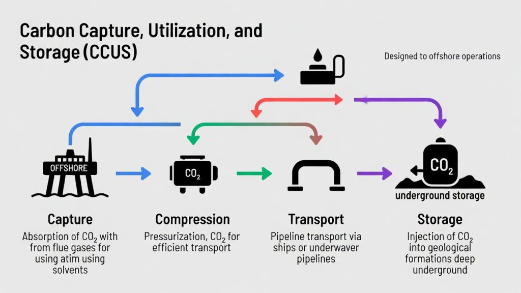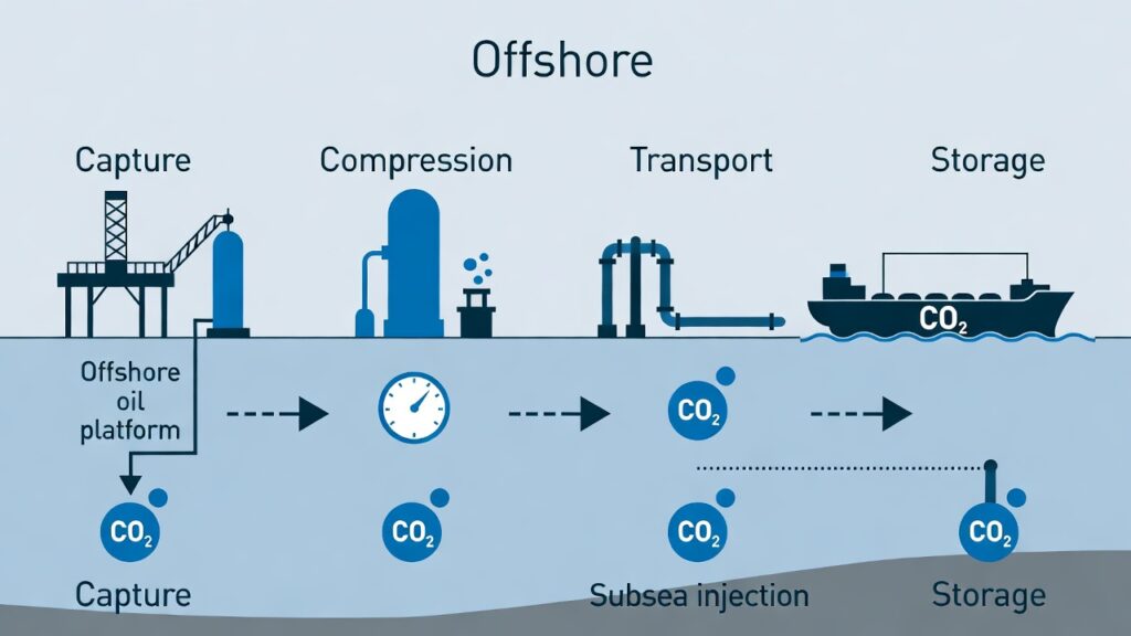 Schematic of full CCUS chain applicable to offshore operations: capture, compression, transport, and storage.