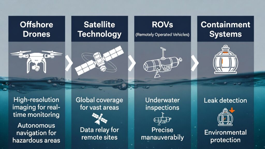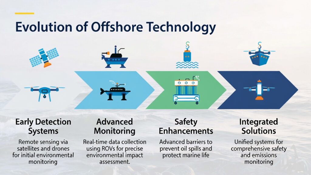 Visual: Evolution of offshore technology infographic, showing drones, satellites, ROVs, and containment systems that support both safety and emissions monitoring.