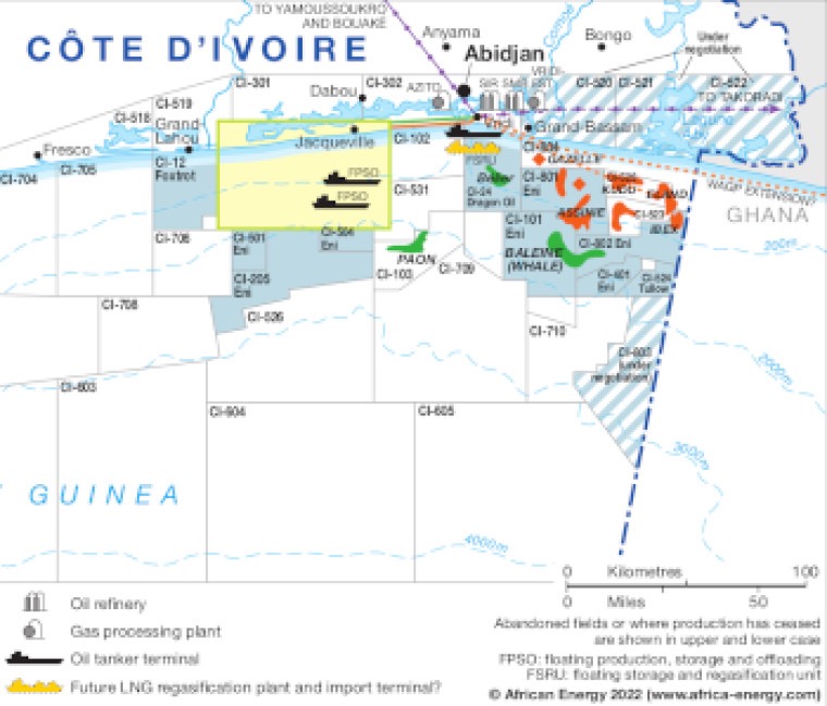 Here are maps illustrating Côte d’Ivoire’s offshore blocks, including the location of Calao, Baleine, and surrounding concessions in the Gulf of Guinea.