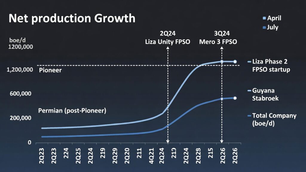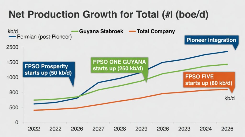 ( image: Bar/line chart showing net production growth: Permian (post-Pioneer), Guyana Stabroek, and total company boe/d, with callouts for key FPSO startups and Pioneer integration.)