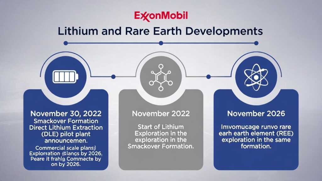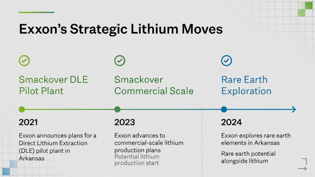 ( image: Timeline infographic showing Exxon’s lithium announcements, Smackover DLE pilot → commercial scale, and parallel rare earth exploration.)