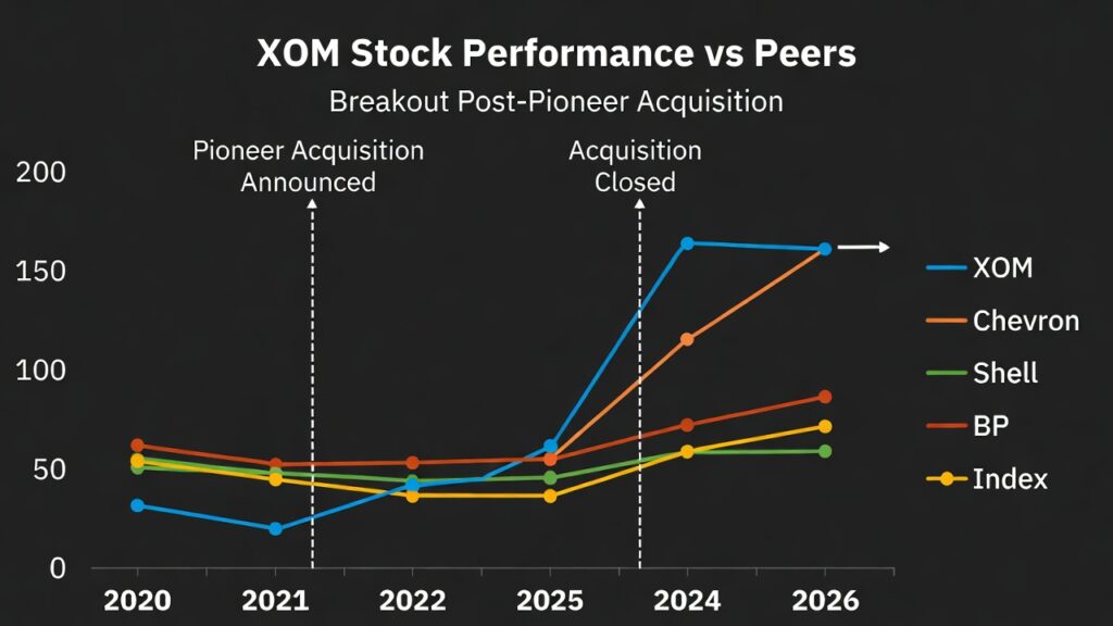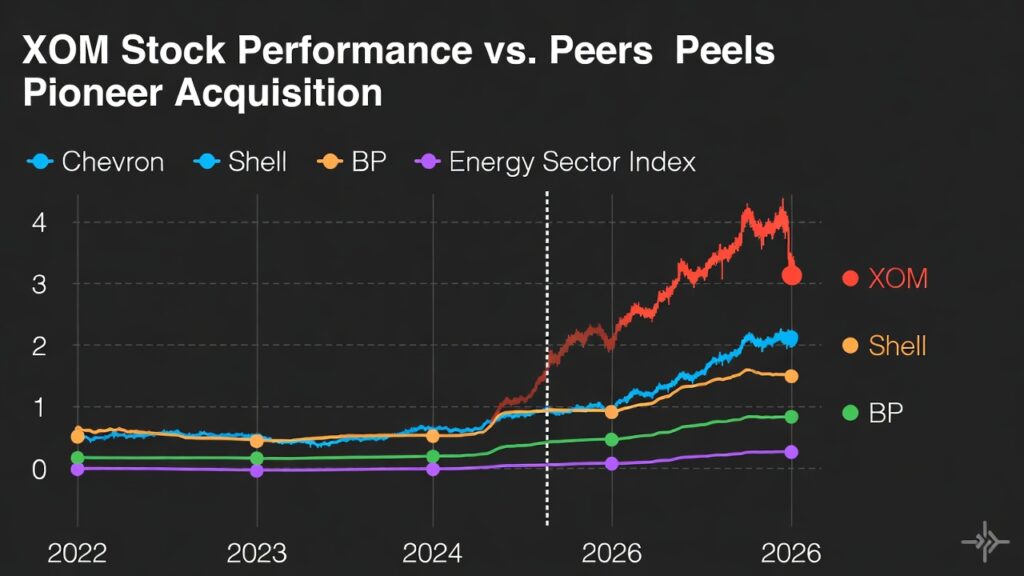 ( image: Line chart comparing XOM stock performance to Chevron, Shell, BP, and energy sector index, highlighting 2026 breakout post-Pioneer close.)