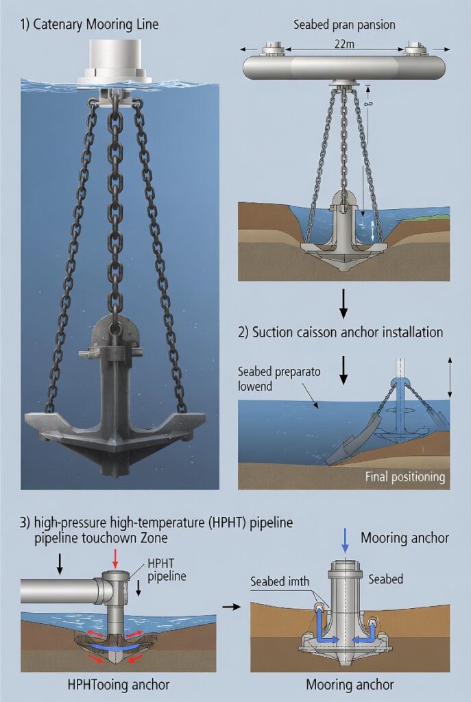 Pipeline touchdown points risk scour, free spans, and upheaval buckling. Mooring anchors (suction caissons, drag embeds) face pull-out, dragging, and scour around the foundation — the same soil-structure interaction and stability risks.