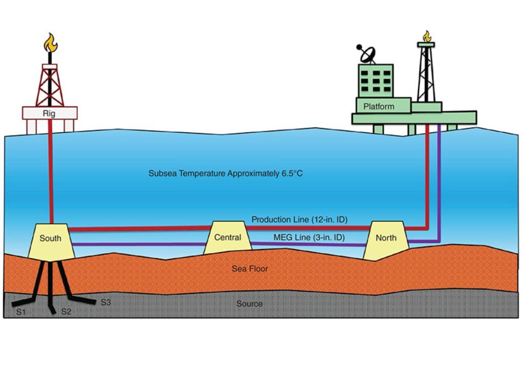 (Above: Diagram of a subsea production system with hydrate plug remediation—showing production lines, MEG injection, and cold seabed temperatures ~6.5°C.)2026 Advancements: