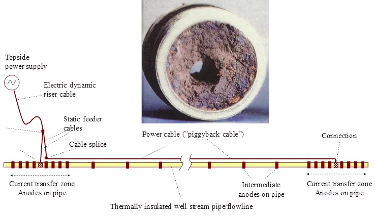 (Above: Direct Electrical Heating (DEH) system diagram—piggyback cable generates resistive heat along the flowline for continuous or spot heating.)