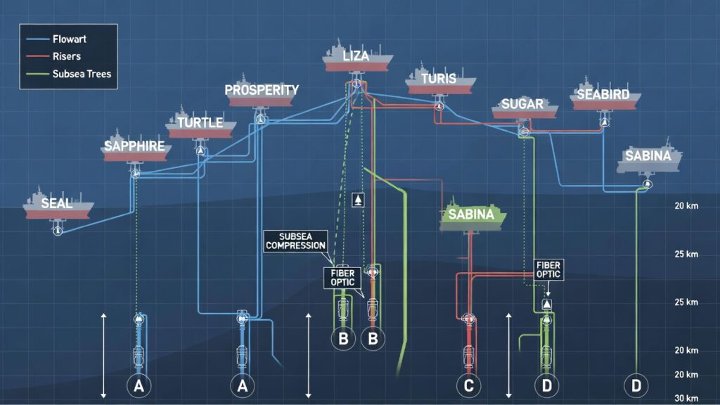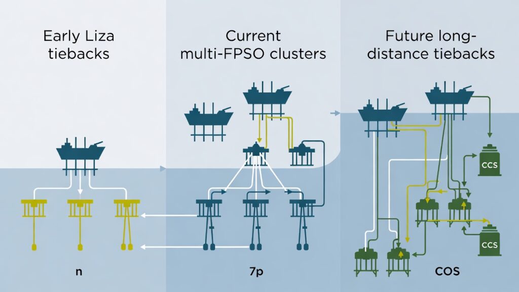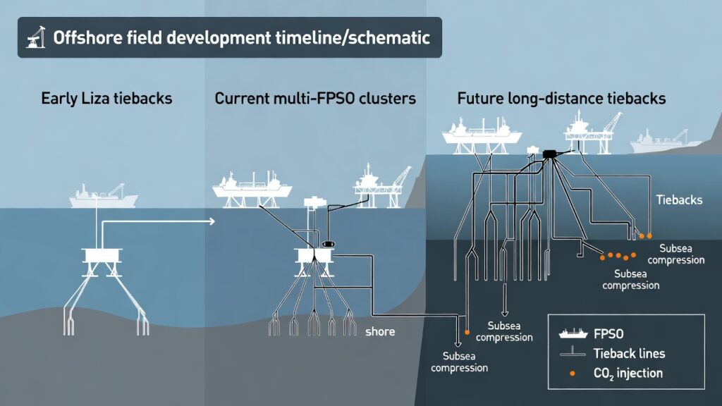 ( image: Timeline/schematic showing progression from early Liza tiebacks → current multi-FPSO clusters → future long-distance tiebacks with subsea compression and CCS.)