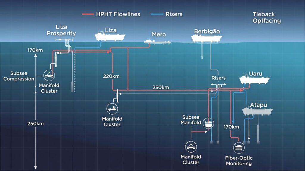 (image: Map/schematic showing FPSOs (Liza, Prosperity, Uaru, etc.), subsea manifold clusters, HPHT flow lines, risers, and tieback distances, with callouts for subsea compression and fiber-optic monitoring.)