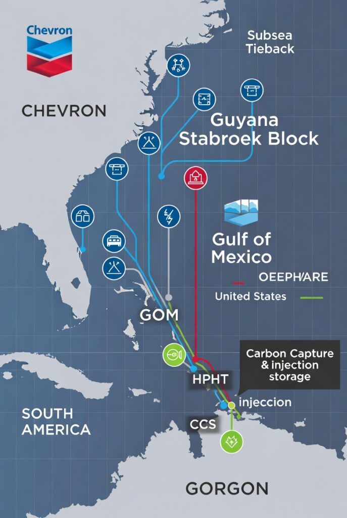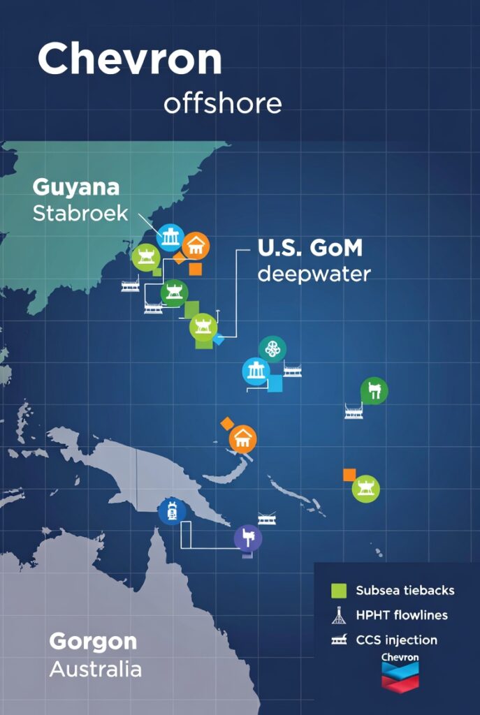 ( image: Map showing Chevron’s key offshore assets (Guyana Stabroek, U.S. GoM deepwater, Gorgon Australia), with icons for subsea tiebacks, HPHT flow lines, and CCS injection.)