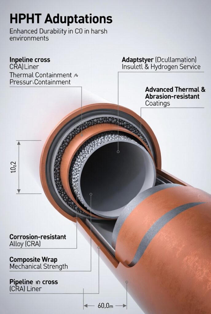 (Diagram illustrating HPHT pipeline cross-section adaptations for CO₂ and hydrogen: CRA liners, composite wraps, and advanced coatings.)