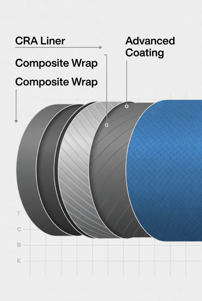 • Use corrosion-resistant alloys (CRAs like Inconel 625, duplex) or mechanically lined pipe (MLP) for internal protection.