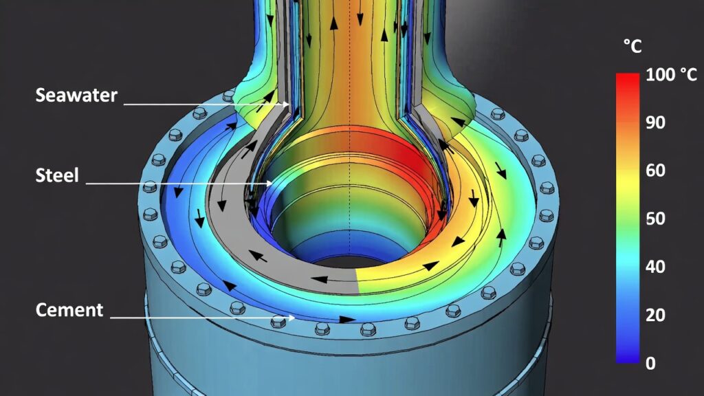 Seawater flows around the wellhead (currents, tides) create forced convection that’s hard to estimate with empirical Nu numbers. CFD simulates external flow over the Christmas tree, connector, and housing to compute local h (heat transfer coeff.) values—often 100–500 W/m²K or higher with currents. This beats conservative assumptions that overpredict cooldown or underpredict heating.Recent studies (e.g., Lu et al., 2011; referenced in multiple Ocean Engineering papers) validate CFD for seabed equipment thermal performance, directly applicable to wellheads.