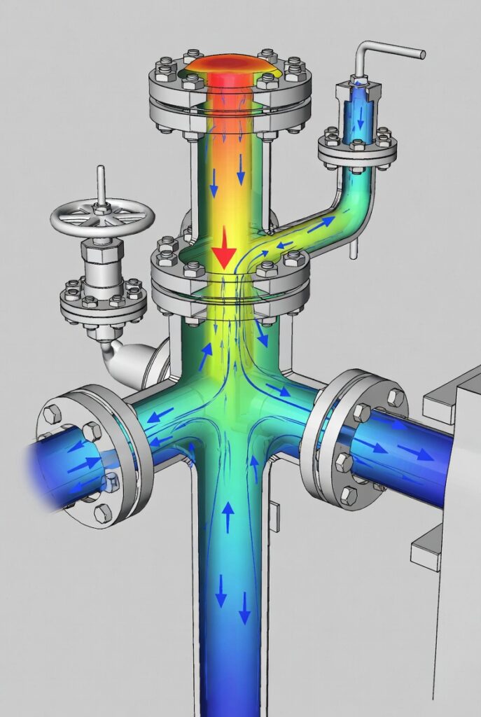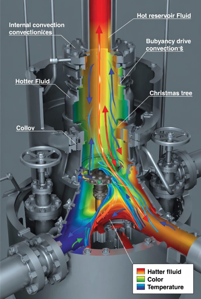 Inside the wellhead/Christmas tree, hot reservoir fluid drives buoyancy-driven flows. CFD models this internal convection (e.g., Marotta et al., 2014 FEM-CFD hybrid approaches) to predict local hotspots and cooling rates during shut-in/production cycles.