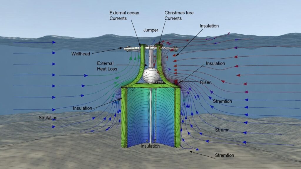 CFD incorporates external currents (e.g., 0.5–2 m/s) to assess insulation layer performance on jumpers/risers tied to wellheads. Poor insulation accelerates cooldown, increasing contraction risks; CFD quantifies it precisely.