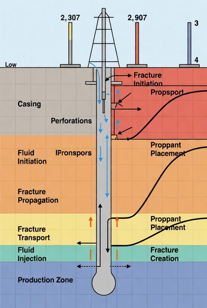 Fig. 5: Schematic of hydraulic fracturing stimulation in an HPHT well, illustrating proppant placement and pressure zones.