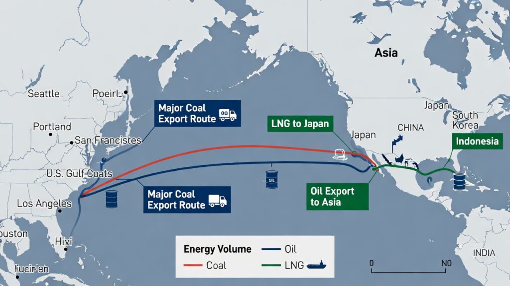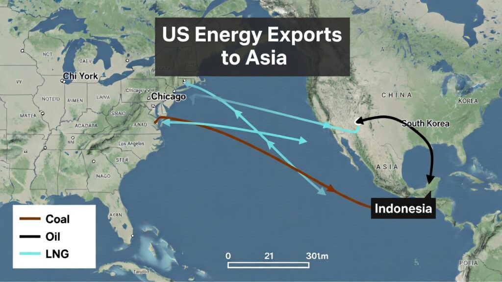 (Map highlighting US energy export routes to Asia, with Indonesia marked as a key new destination for coal, oil, and LNG shipments.)