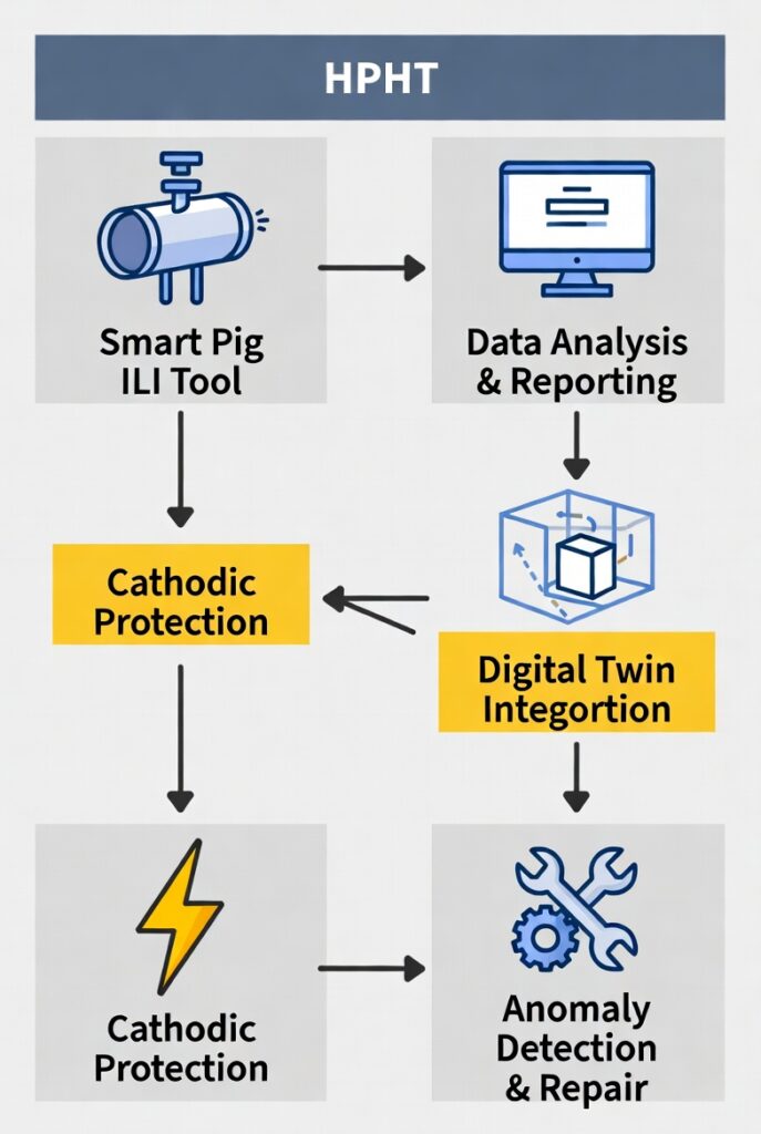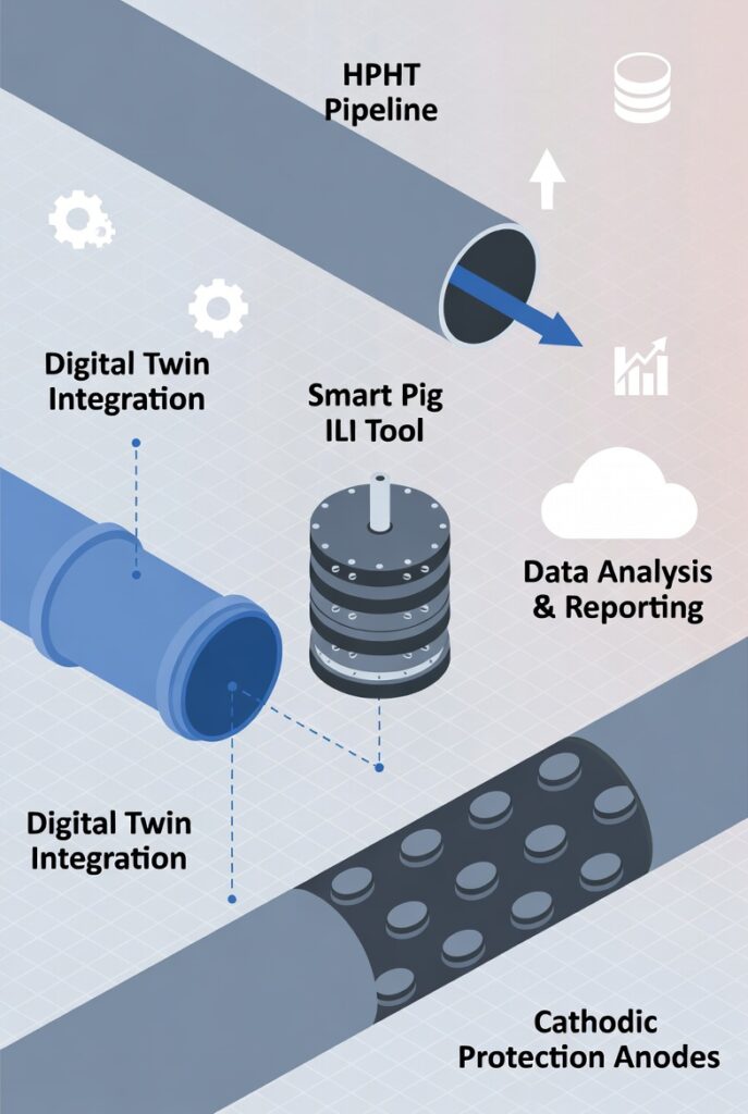 ( H2: Diagram of HPHT pipeline integrity management showing smart pig ILI tool, digital twin integration, and cathodic protection anodes.)