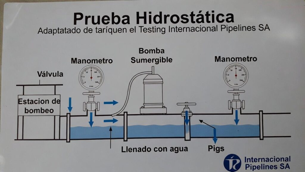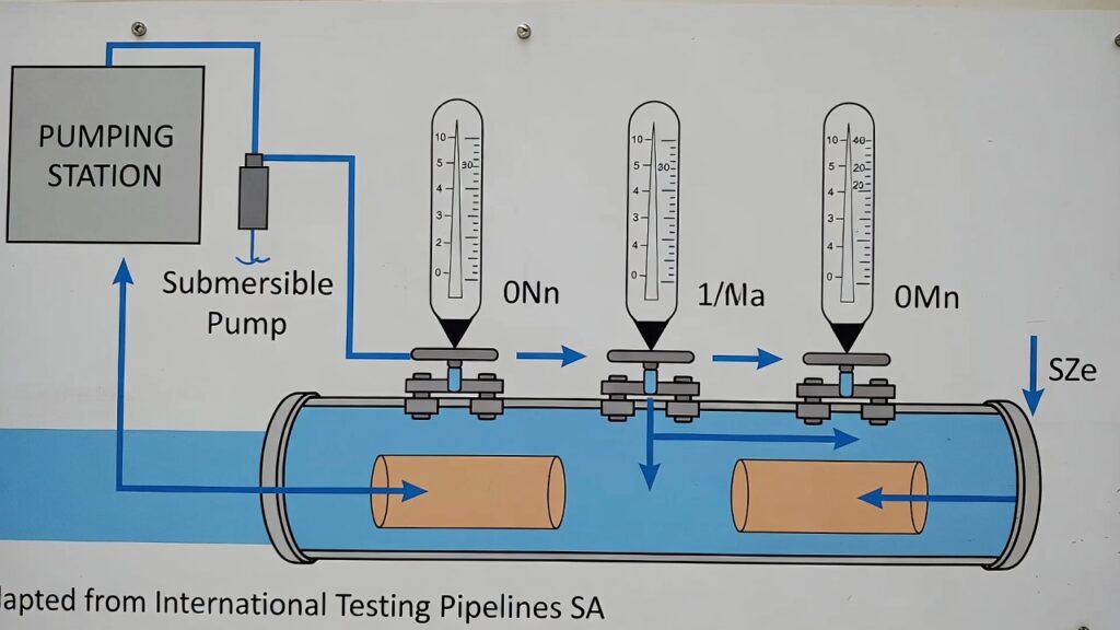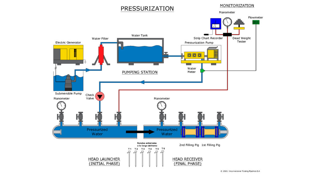 Hydrostatic pressure testing schematic: Pumping station fills the pipeline with water via submersible pump and manometers monitor pressure. Pigs ensure proper filling and pressurization. Source: International Testing Pipelines SA.
