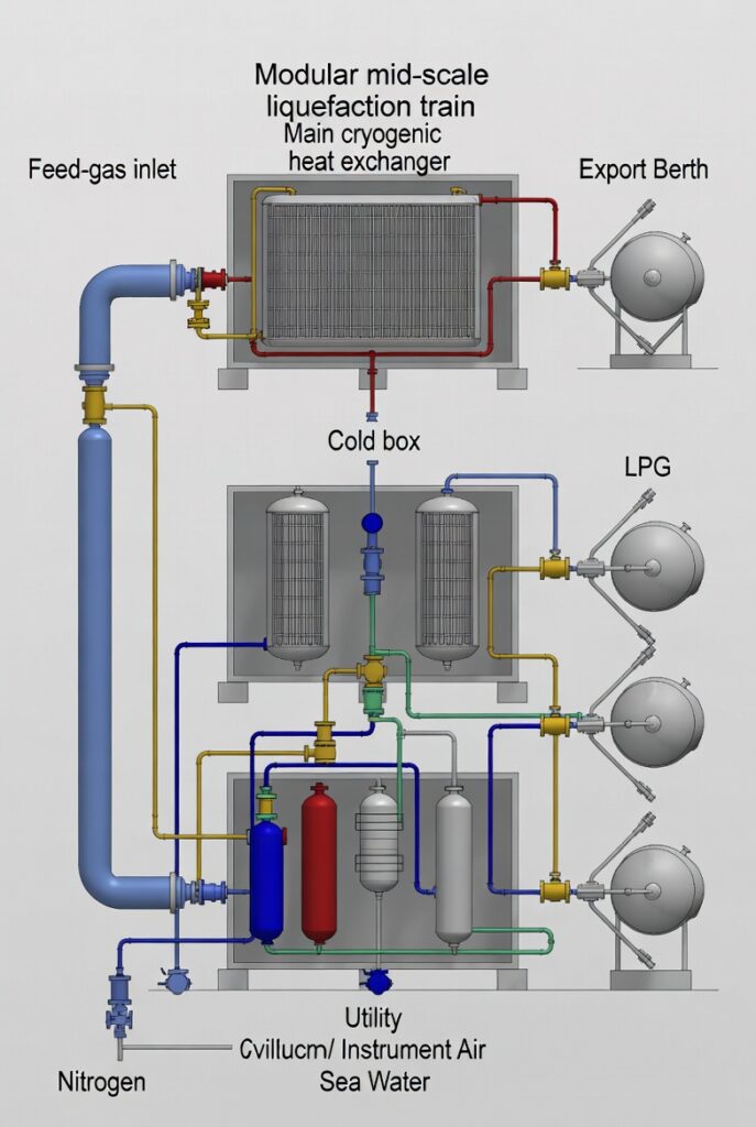 ( image: Diagram of modular mid-scale liquefaction trains, showing compact layout, feed-gas inlet, and export berths.)