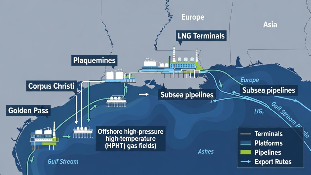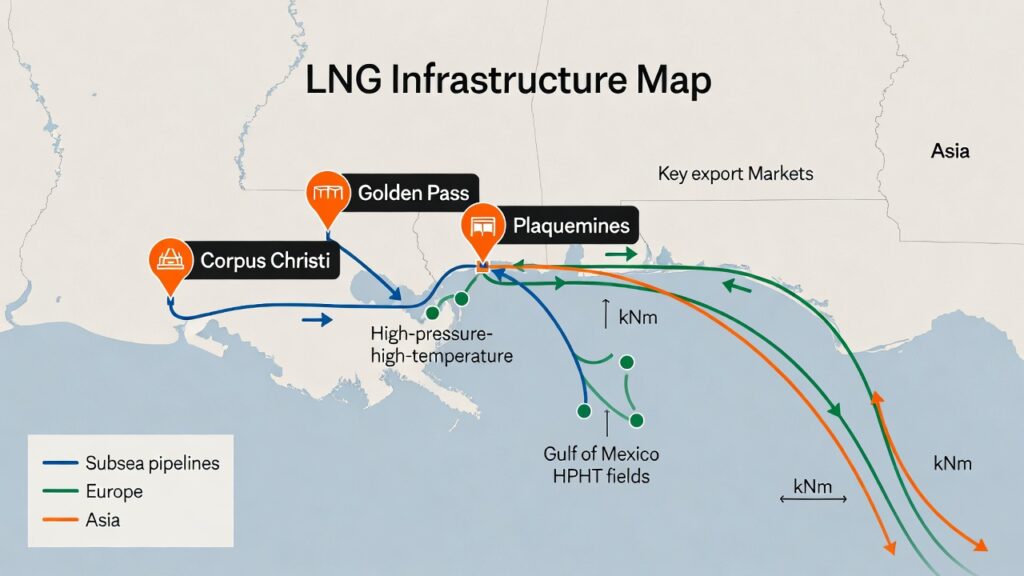 (image: Map/schematic showing major LNG terminals (Golden Pass, Plaquemines, Corpus Christi), offshore HPHT fields, subsea pipelines, and export routes to Europe/Asia.)