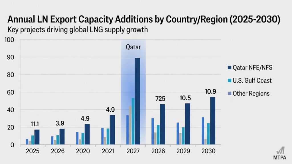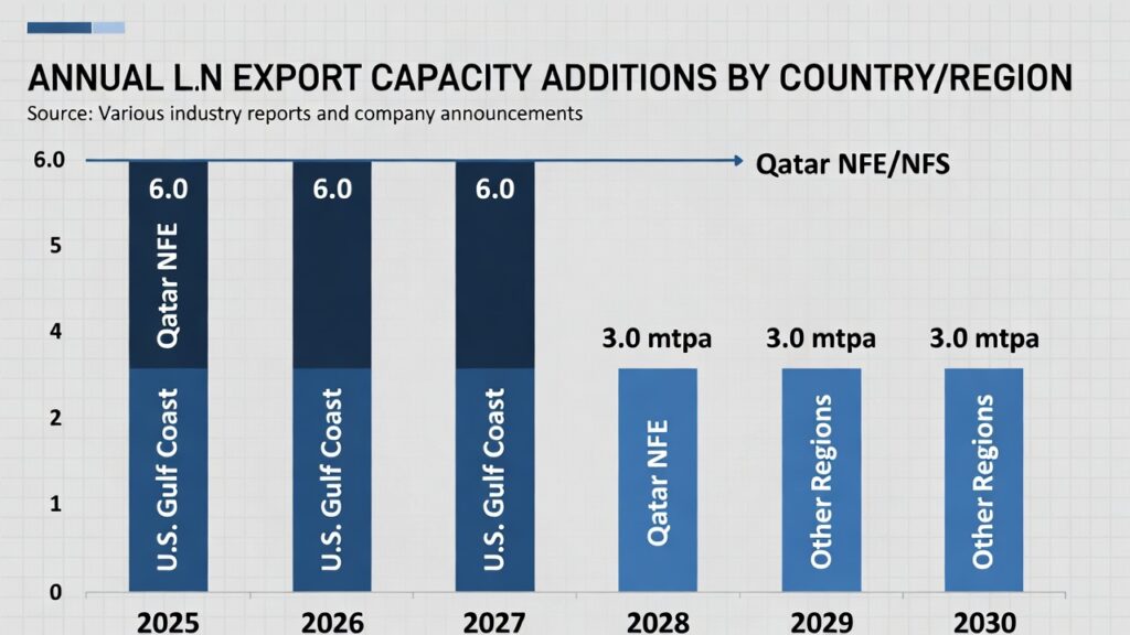 (image: Bar chart showing annual capacity additions by country/region: Qatar NFE/NFS, U.S. Gulf Coast projects, others. Highlight 2026–2027 as the peak wave.)