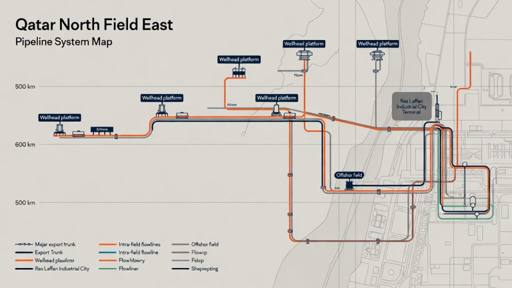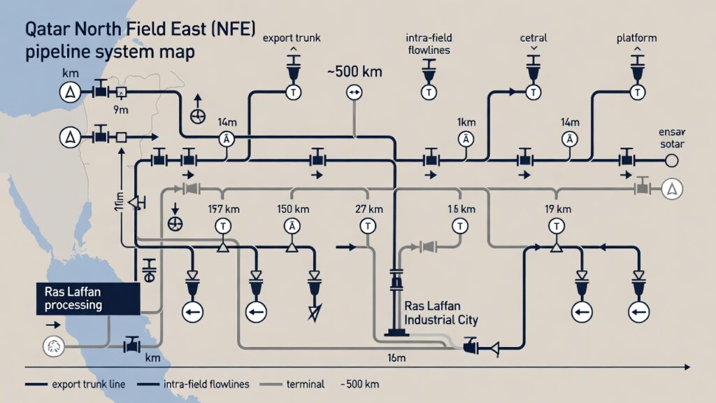 ( image: Map/schematic of the ~500 km NFE pipeline system showing export trunk lines, intra-field flowlines, wellhead platforms, and Ras Laffan terminal.)