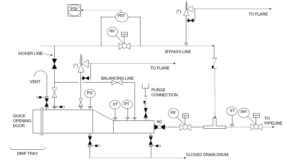 This P&ID diagram shows a typical pig launcher/receiver setup, including kicker lines, bypass valves, vents, and safety features for safe operations.In subsea scenarios, pigging may use subsea launchers, downline flushing from vessels, or production flow redirection adding complexity but enabling routine maintenance without full shutdowns.