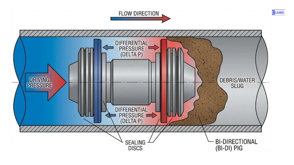 Here’s a cross-sectional view of a bi-directional cleaning pig in action, showing how differential pressure drives the pig forward while sealing discs push debris/slugs ahead.The Pigging Process: Launcher to ReceiverPigging requires pig launchers (to insert the pig) and receivers (to retrieve it and collect debris). In offshore setups, these are often subsea or topside on platforms.A typical sequence: