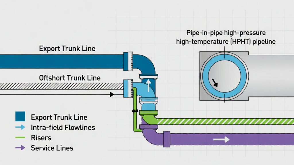 - Flowlines / Intra-field Pipelines: Smaller-diameter lines connecting individual wells to manifolds, risers, or processing platforms within a field.