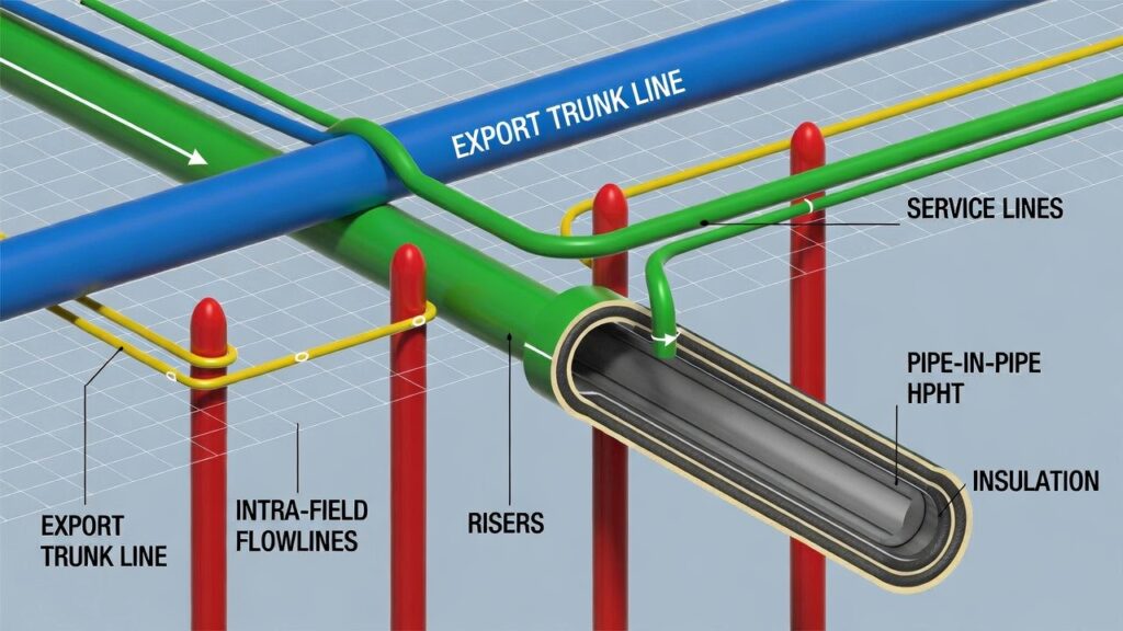 (image: Color-coded schematic showing export trunk line, intra-field flow lines, risers, service lines, and pipe-in-pipe HPHT cross-section with labels for each type.)