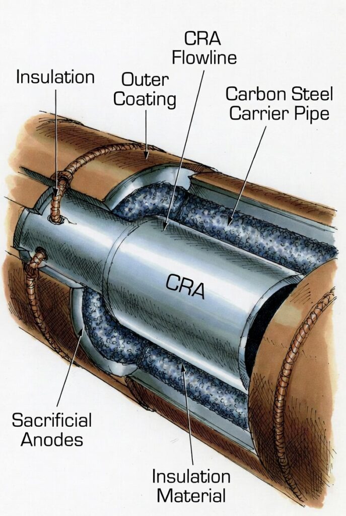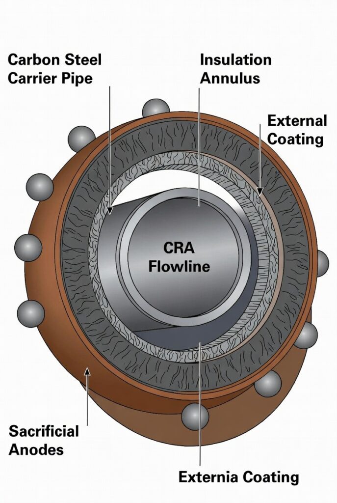 ( image: Cutaway diagram showing inner CRA flowline, insulation annulus, outer carbon steel carrier pipe, coatings, and anodes.)