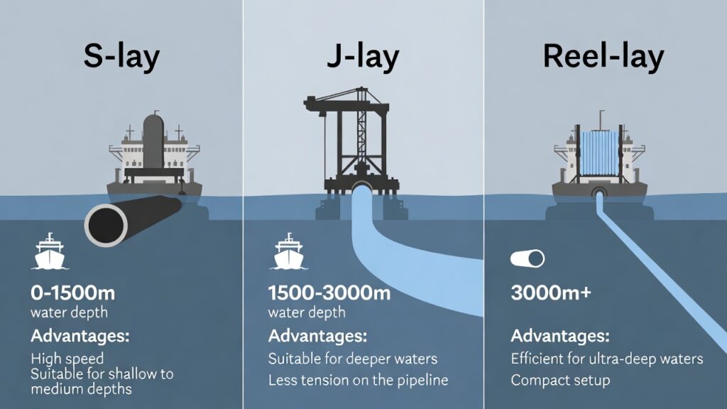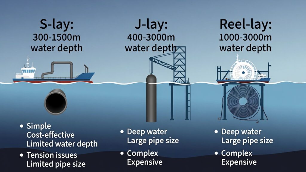 (image: Side-by-side illustrations of S-lay, J-lay, and Reel-lay techniques with vessel types, water depth ranges, and advantages/drawbacks.)