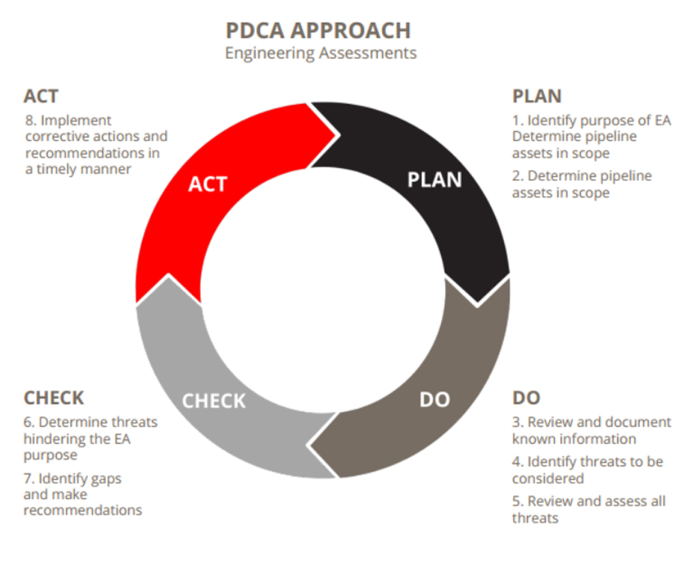 Figure 2: PDCA (Plan-Do-Check-Act) Approach for Pipeline Engineering Assessments – A continuous improvement framework widely used in PHMSA-aligned integrity programs: Plan (scope/threats), Do (assessment), Check (gaps/recommendations), Act (implement corrections). This cycle supports ongoing program evaluation and risk mitigation.