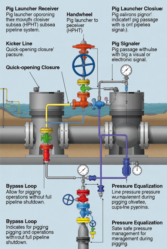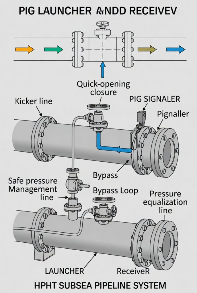 Typical pig launcher and receiver setup in an HPHT subsea pipeline system showing kicker line, quick-opening closure, pig signaler, bypass loop, and pressure equalization for safe pigging operations.