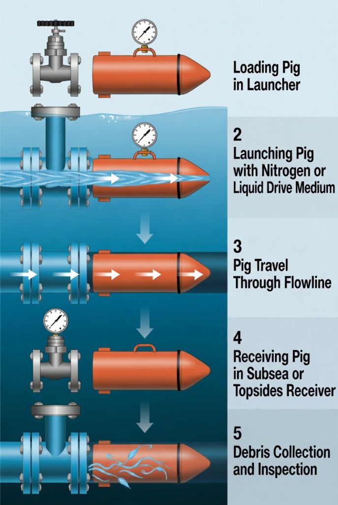Pigging operation sequence in long subsea tie-back showing loading, launching, travel, receiving, and debris collection/inspection stages.”