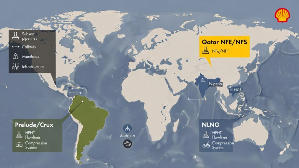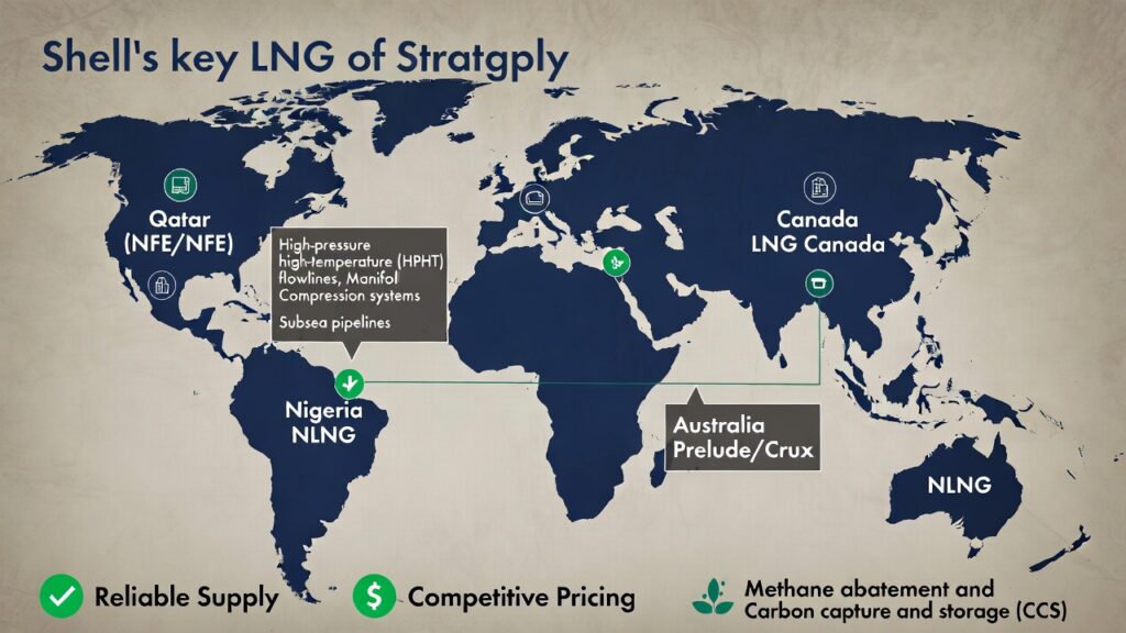 ( image: World map highlighting Shell’s key LNG supply sources (Qatar NFE/NFS, Australia Prelude/Crux, Nigeria NLNG, LNG Canada), with subsea pipeline/callout icons for HPHT flowlines, manifolds, and compression.)Shell’s LNG strategy emphasizes reliable supply, competitive pricing, and sustainability (methane abatement + CCS) — solving the energy trilemma.