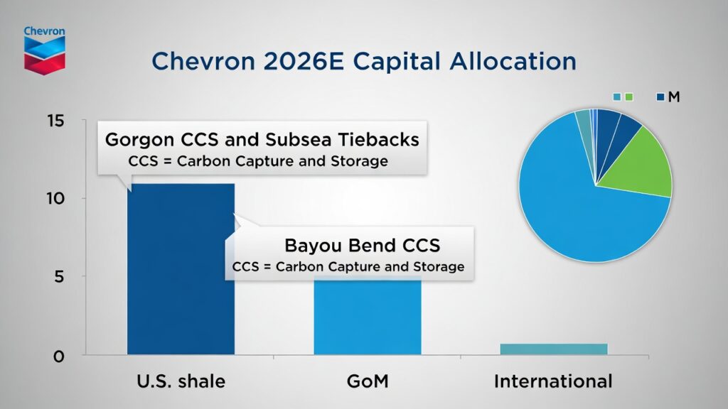 Chevron (NYSE: CVX) is executing a disciplined, upstream-focused strategy in 2026, with heavy investment in oil & gas growth while advancing lower-carbon initiatives. Capex guidance of $18–19B (potentially up to $21B) prioritizes high-return upstream, with subsea tech playing a key role in deepwater and LNG feed-gas.